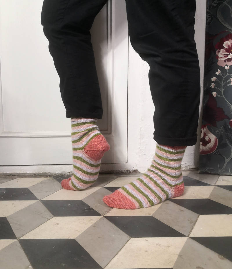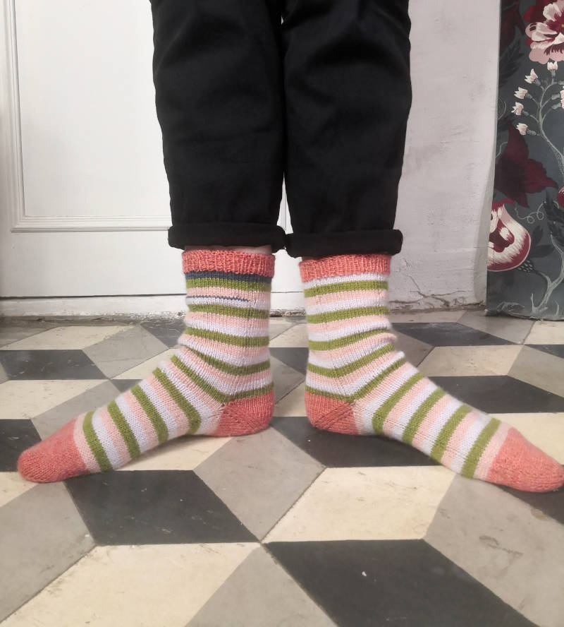 Je vous en parlais début juillet, manquant d’inspiration, je m’étais lancée dans des chaussettes à rayures pour finir mes restes de pelotes d’Arwetta classic de Filcolana (ma laine habituelle pour tricoter des chaussettes). J’étais partie sur le patron « Mercredi rayures » du livre Tricoter ses chaussettes, mais j’avais finalement modifié le motif, trouvant que changer de fil tous les deux rangs, c’était beaucoup trop pénible.