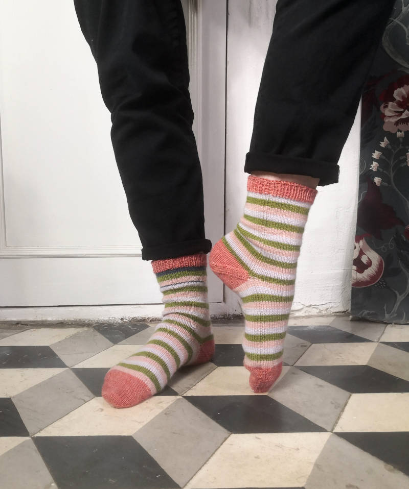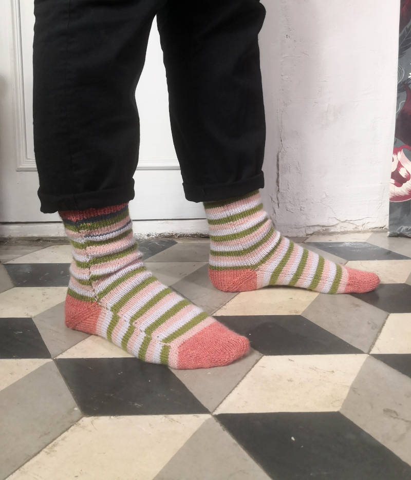J’ai vraiment détesté tricoter ces chaussettes. Rentrer tous les fils sur la première chaussette avait été une telle tannée que sur la deuxième, j’ai suivi les conseils d’une personne sur Instagram en faisant courir mes fils à la verticale et en les maintenant au dos de l’ouvrage comme pour du jacquard. Cette technique m’a fait économiser un peu de temps à la fin, mais je trouve le rendu assez moche et c’était malgré tout pénible puisque les fils n’arrêtaient pas de s’emmêler dès que je mettais mon tricot en pause. En plus, j’ai dû me tromper dans la répartition de mes mailles sur mes aiguilles, ce qui fait que le côté moche avance un peu sur le devant du pied et j’ai oublié de glisser ma première maille pour que les rayures soient en face les unes des autres. Rien ne va sur cette deuxième chaussette…