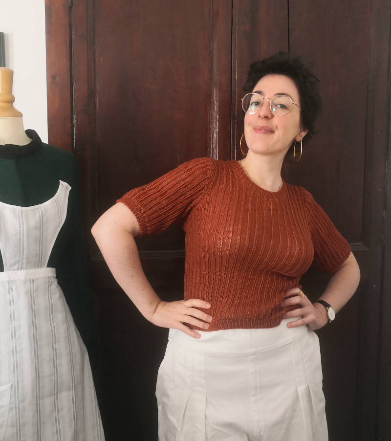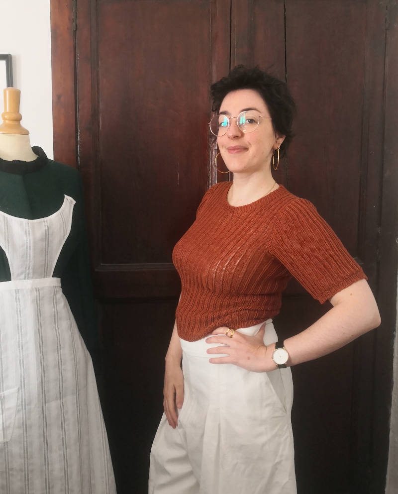 Comme je ne suis pas très expérimentée en tricot et que les patrons de tricot vintage me font peur, j’ai essayé de trouver un patron moderne qui pourrait ressembler aux modèles des années 1930. Il fallait un t-shirt moulant avec des manches montées suffisamment longues et je suis tombée sur le patron du t-shirt Calliope d’Alice Hammer en regardant un peu les fils de chanvre chez Natissea. J’aime beaucoup les patrons d’Alice Hammer en général. C’est avec elle que j’ai commencé le tricot et je prends toujours du plaisir à tricoter ses modèles donc le choix a été rapide.