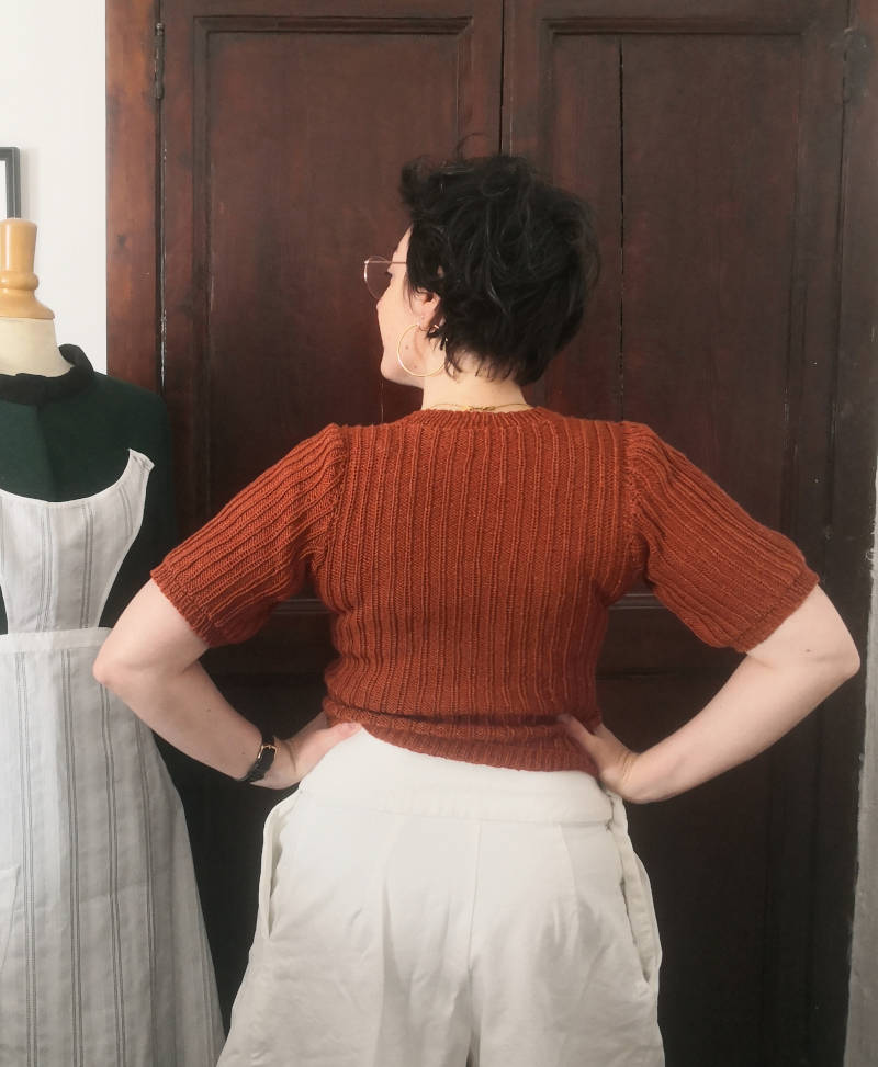 Jusqu’à ce qu’il soit terminé, j’ai eu un gros doute sur le rendu final parce que j’avais vraiment l’impression qu’il serait trop petit pour moi. Mon échantillon avec les aiguilles recommandées de 3 mm était trop petit donc je me suis lancée avec des aiguilles de 3,5, mais sans refaire d’échantillon. Je voulais qu’il soit un peu plus moulant et un peu plus court que sur les photos du modèle, mais il fallait quand même que j’arrive à rentrer dedans et que ça ne fasse pas trop étriqué. Finalement ça va. Il est peut-être un peu trop court et un peu trop serré pour un rendu fidèle des années 1930, mais ça ne me paraît pas si mal.