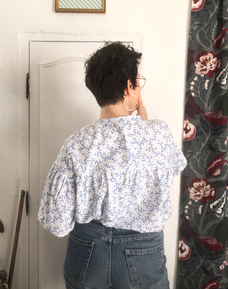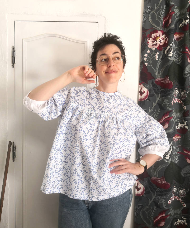 Je savais qu’un mètre serait un peu juste pour faire rentrer toute la blouse et je m’étais dit que je pourrais toujours raccourcir un peu les manches, mais je n’ai pas eu besoin de le faire parce que les tissus Tissoeurs sont imprimés sur une toile blanche avec des marges d’impression (blanches donc) et j’ai eu l’idée d’utiliser ces marges pour garder toute la longueur de manche prévue dans le patron. Je trouve que le résultat fonctionne assez bien avec seulement un mètre de tissu. Je suis ravie d’avoir limité le coût de ce projet à 20,90 €.