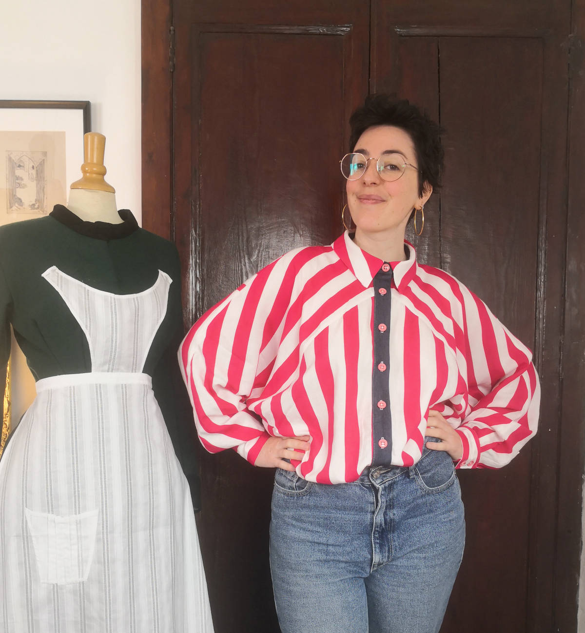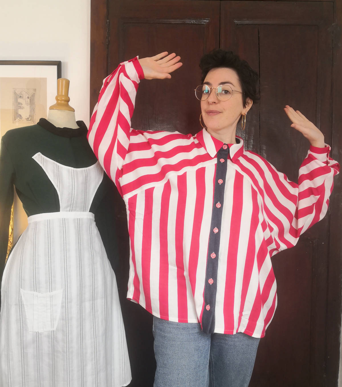 En février dernier, je me suis rendue à des puces couturières où j’ai acheté énormément de coupons (principalement pour coudre des gilets historiques à Romain), dont un coupon de viscose rayée d’1,60 m dont je ne savais, à vrai dire, pas quoi faire, mais il ne coûtait que 3 € et j’aimais ses larges rayures fuchsia. Quand je suis partie à la recherche d’une idée de projet pour ce coupon, ce sont mes copines de couture qui m’ont suggéré une chemise, et je me suis rappelée un patron qui me faisait de l’œil depuis longtemps, celui de LA chemise de la marque Atelier Brunette. J’ai du mal à résister aux patrons de chemise, plus encore quand ils proposent des détails intéressants. Là j’aimais beaucoup les découpes des manches devant et le côté oversize et je me suis dit que ça rendrait certainement très bien avec les rayures de mon tissu.
