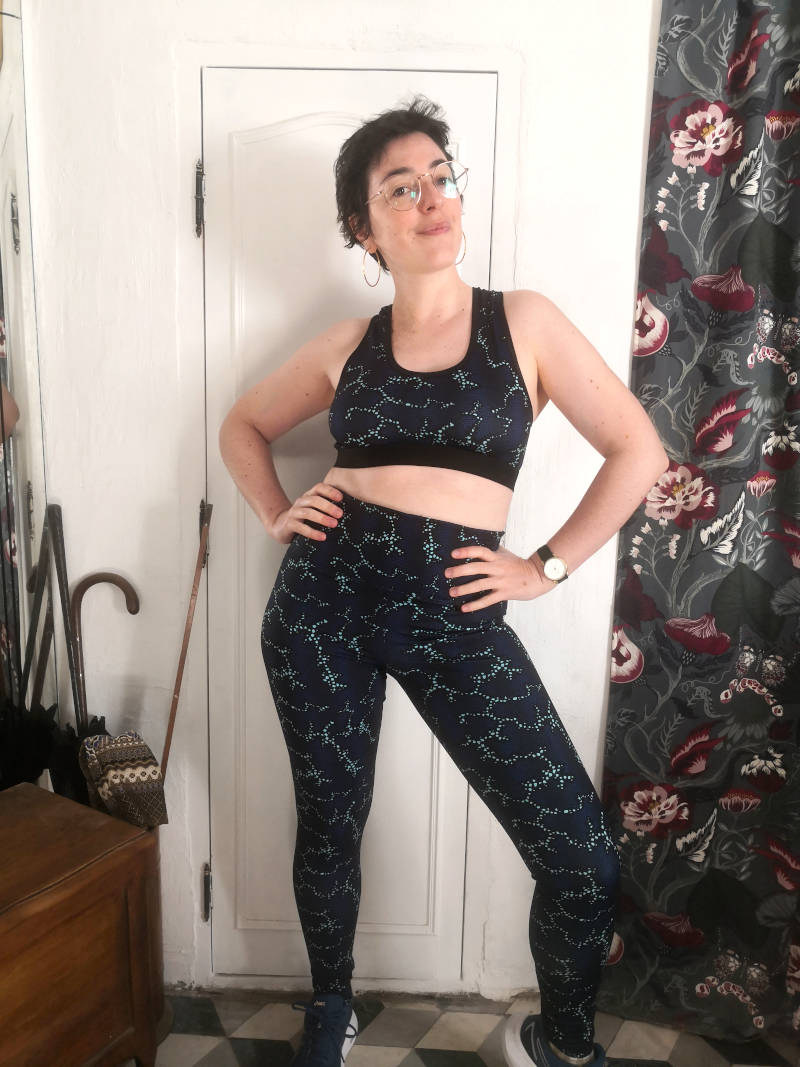 Je suis vraiment ravie de cet ensemble, qui m’a coûté en tout 67,40 € (j’avais commandé 2 mètres du tissu et il est onéreux), mais il me reste certainement de quoi faire un deuxième ensemble avec un legging un peu plus court pour l’été, ce qui est très chouette. Il ne me reste plus qu’à me coudre quelques t-shirts et débardeurs supplémentaires pour porter avec.