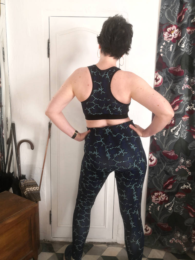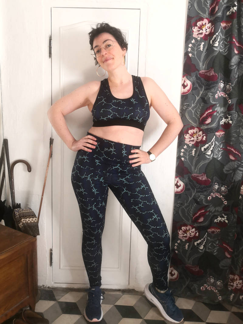 J’ai cousu une taille 42 à la taille qui rejoint le 40 au niveau des hanches sans modification pour cette première fois. J’avais un peu peur de me lancer directement dans mon beau tissu en ne sachant pas s’il y aurait des ajustements à faire, mais ça va. Il faudrait en effet que j’ajuste un peu la fourche (raccourcir la fourche devant et allonger la fourche dos) pour ma prochaine version, mais celle-ci est tout à fait portable. J’ai fait plusieurs séances de sport avec (principalement du pilates) et tout se passe bien donc je suis satisfaite. En outre, je porte toujours un t-shirt ou un débardeur par-dessus la brassière parce que je n’ai pas envie de montrer mon ventre donc ça permet aussi de dissimuler si la ceinture du legging descend un peu trop, mais la taille est suffisamment haute pour limiter les risques.