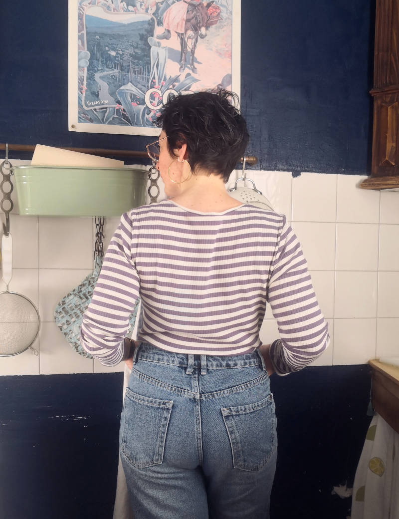Reçu, lavé et séché, il a été coupé et cousu immédiatement. J’ai cette fois choisi de faire la version décolleté dos et je l’adore. Je me sens super belle dedans, elle me fait du bien au moral et elle est extrêmement confortable. Avec la salopette, c’est vraiment devenu mon uniforme et je crois que je vais en coudre une autre version dès que je trouverai un autre jersey à motifs sympa.