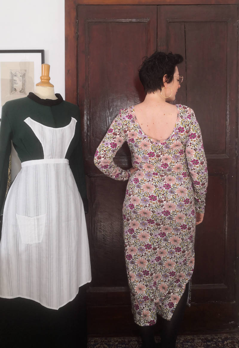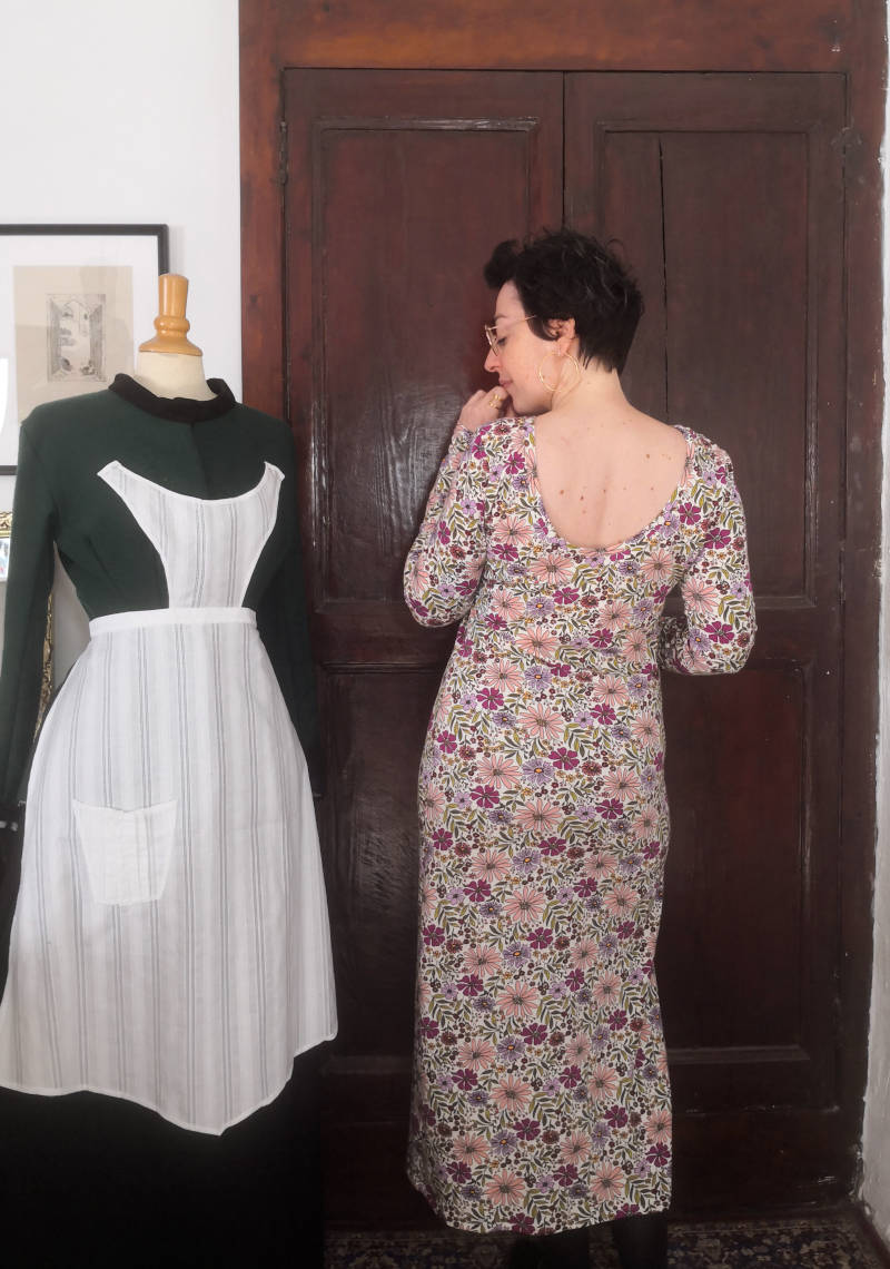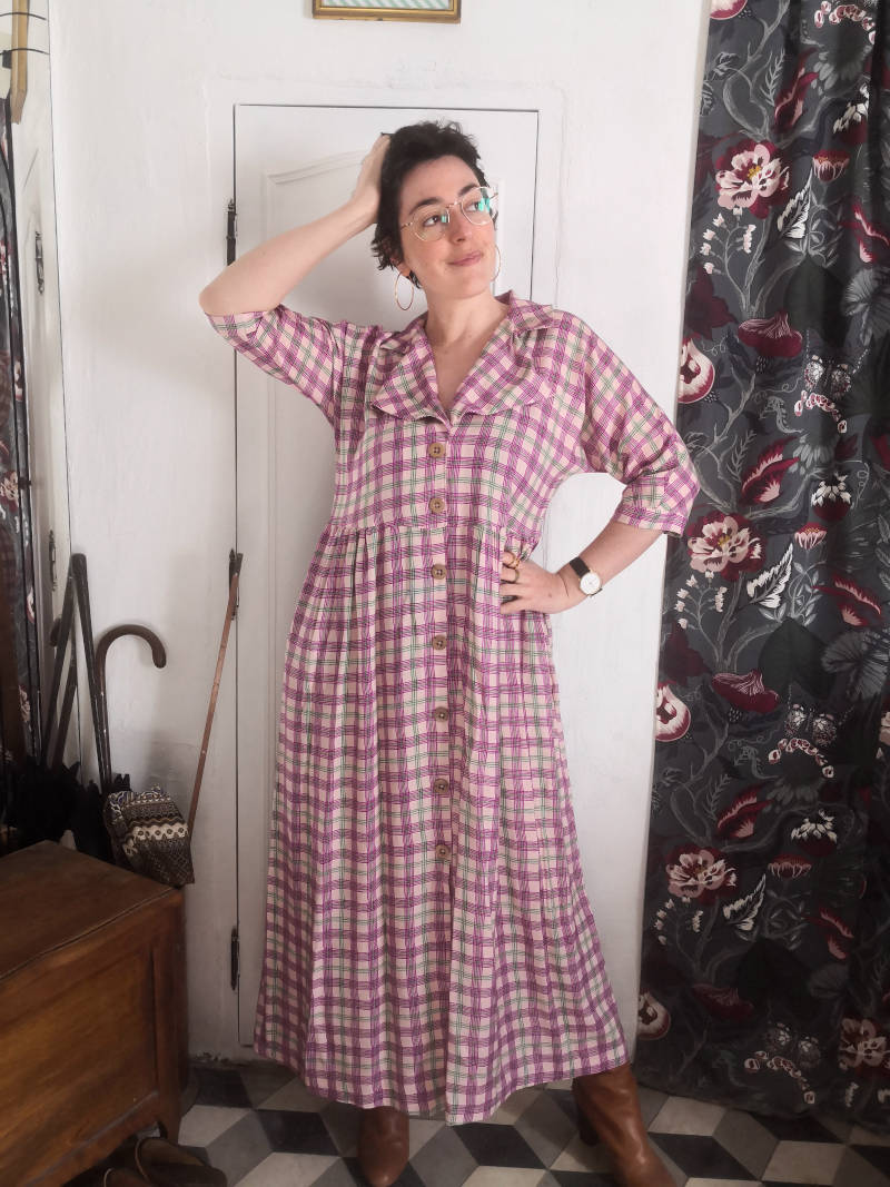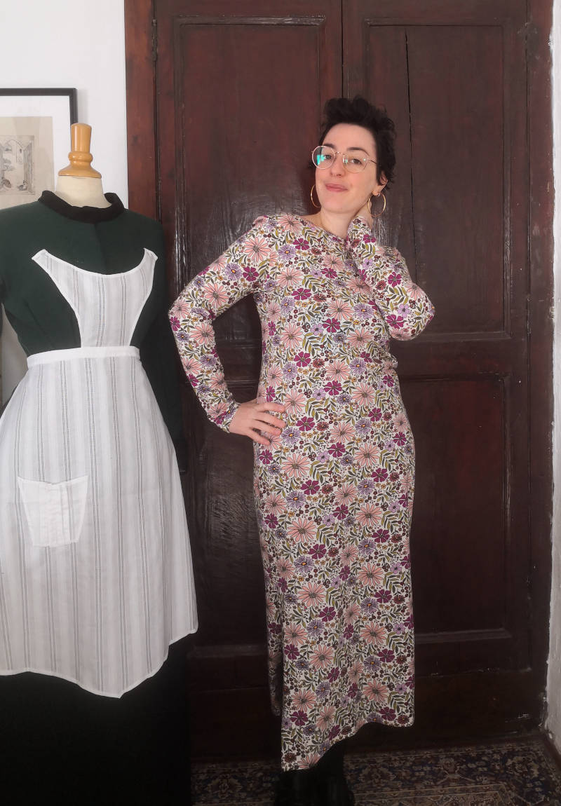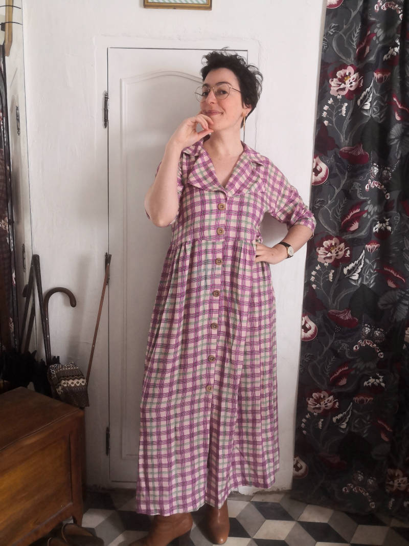 Cette décision a été excellente. Une fois prise, j’ai coupé mon tissu et cousu ma robe en un temps record, je l’ai portée plusieurs fois et je suis très contente d’avoir une nouvelle robe facile à porter pour la mi-saison. J’aime toujours beaucoup cet imprimé donc je suis contente de le porter plutôt que le laisser dormir éternellement dans mon stock, d’autant que c’est de la viscose, quitte à en acheter en dépit de son coût humain et environnemental, je préfère l’utiliser.