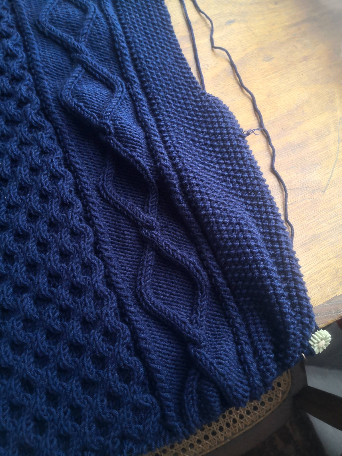 Je tricote la taille L en aiguilles de 5mm dans la laine big mérino de Drops (coloris bleu marine). Normalement le modèle se tricote en aiguilles de 4,5mm, mais je n’en ai pas, et les aiguilles de 5mm me permettaient d’avoir le bon échantillon donc je me suis lancée en croisant les doigts. Je crains que le rendu soit un peu lâche et ajouré à cause de ce choix, mais le pull devrait être beau quand même. La laine big mérino de Drops se détend normalement beaucoup au blocage, mais mon échantillon en motif nid d’abeille n’a pas beaucoup bougé après passage à l’eau donc je pense que ça devrait aller à peu près.